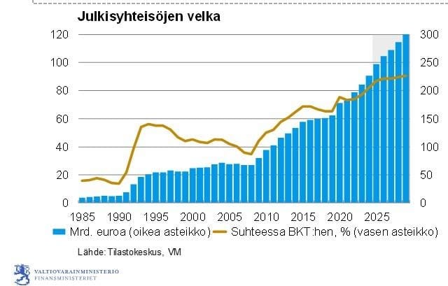 - Kasvun puuttuessa ikääntyvän kansan julkinen talous velkaantuu hallitsemattomasti. Samalla julkiset menot vs Bkt nousee 60 %:iin, mikä on yksi maailman korkeimpia