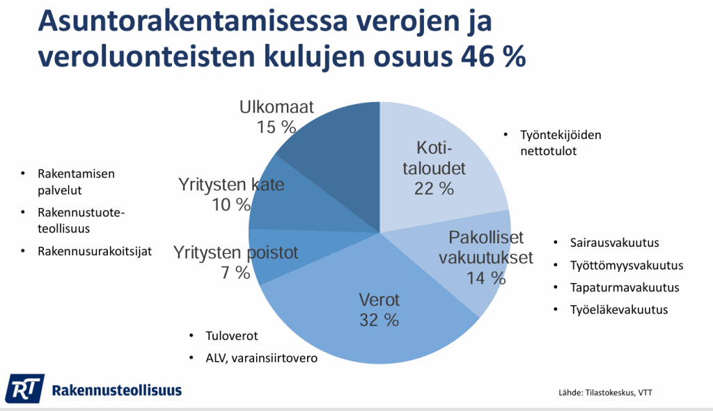 Uutta asuntotuotantoa verotetaan rajusti. Uuden asunnon verot ja veroluonteiset ovat kaikkinensa 46 % hinnasta. Tämä johtaa siihen, että 300.000 € uudessa asunnossa verojen osuus on 138.000 €.