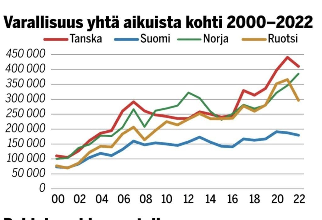 - Kasvun puuttuessa ja julkisen vajeen kasvaessa kansalaiset ovat vähävaraisia ja köyhtyvät suhteellisesti lisää – suomalaiset ovat nyt varallisuudella mitaten läntisen Euroopan toiseksi vähävaraisimpia ja entisen Itä-Euroopan maat uhkaavat mennä ohitsemme.