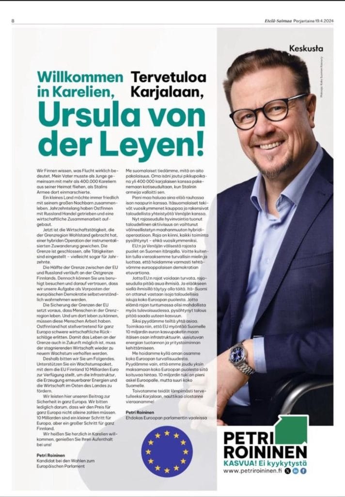 Toiseksi, huomataan että itäinen Suomi muodostaa puolet EU:n itärajasta. Yhessä EU:n kanssa luodaan 10 miljardin euron elinvoima- ja turvallisuusohjelma, jolla vahvistetaan puolta EU:n itärajasta.